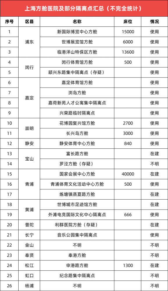 8日,上海日增本土病例(確診+無癥狀)已破兩萬。在抗疫最緊要關(guān)頭,登上老百姓關(guān)注排行榜榜首的,非以下兩個(gè)問題莫屬。一個(gè)是確診和密接是否能及時(shí)轉(zhuǎn)運(yùn);一個(gè)則是居家隔離抗疫是否能有民生保障。毋庸置疑,在上海抗疫方針不斷調(diào)整變化的形式下,政府如何解決病床缺口讓普通老板姓也擔(dān)憂不已。社交平臺(tái)上我們經(jīng)常能看見的、曝光較為頻繁的以世博方艙、新博覽會(huì)展方艙為代表的浦東方艙陣營(yíng),因最早加入抗疫前線,公眾較為熟悉。那么放眼整個(gè)上海,還有哪些方艙隔離點(diǎn)呢?CEIDI西遞根據(jù)網(wǎng)絡(luò)上不完全統(tǒng)計(jì),將上海區(qū)域隔離點(diǎn)匯總?cè)缦拢?