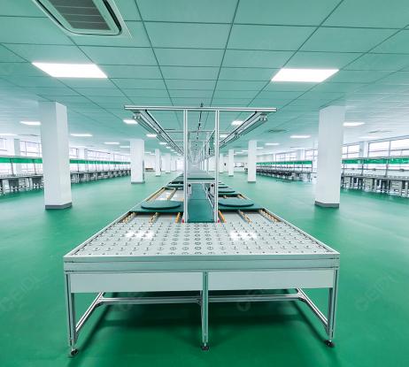 三層電控車間地面、吊頂全部做防靜電處理,且地面區域以6S車間標準劃分標示線(熱熔膠)。地面整體無縫,并與墻面一體化,環氧鋪至墻面(包括與土建墻接觸位置),與墻板平齊。