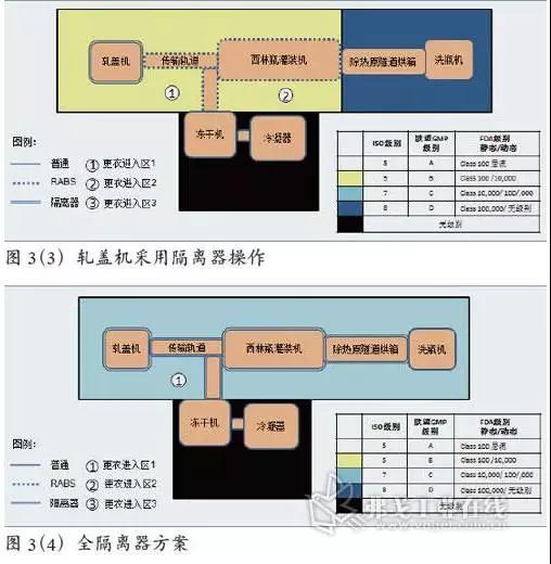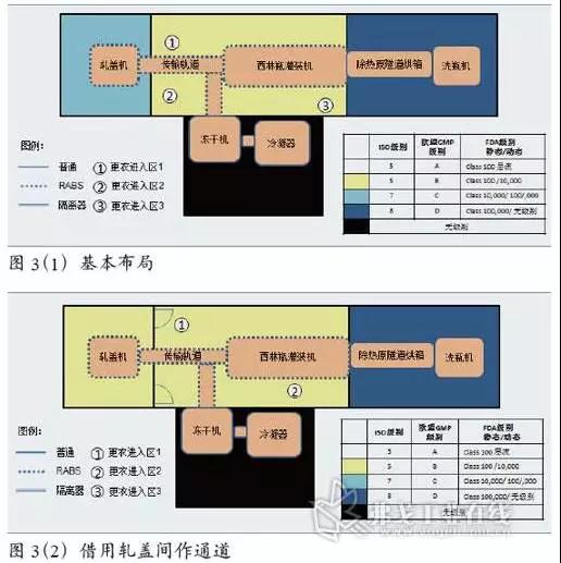 這一方案與方案二有一些類似。但是軋蓋機和灌裝機直接放在同一個B級房間。通過采用隔離器,試圖避免軋蓋過程中粉塵對環(huán)境帶來的污染風(fēng)險,見圖3(3)。在更衣區(qū)方面的考慮和前一個方案一致。