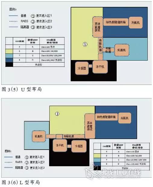 L型布局在國內(nèi)也很常見。與U型布局相似,空間的節(jié)省也是其明顯的優(yōu)勢。B級潔凈室只需一個更衣區(qū)進出即可,見圖3(6)。不過在灌裝機的維修一側(cè)在層流保護下作檢修或者拆換泵等操作仍存在潛在的污染風(fēng)險。