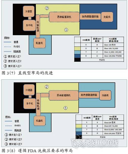 由于所有設(shè)施均在一個房間,在生產(chǎn)方面具有很好的聯(lián)通性。通過對環(huán)境要求的降低,也節(jié)約了能耗和運行成本。在環(huán)境控制和相互影響方面,例如除熱原隧道烘箱帶來熱量的發(fā)散、從房間抽取空氣帶來的新風(fēng)補充問題,以及洗瓶機帶來的濕度控制問題等,需在設(shè)計中妥善考慮,但不在本文的討論范圍。